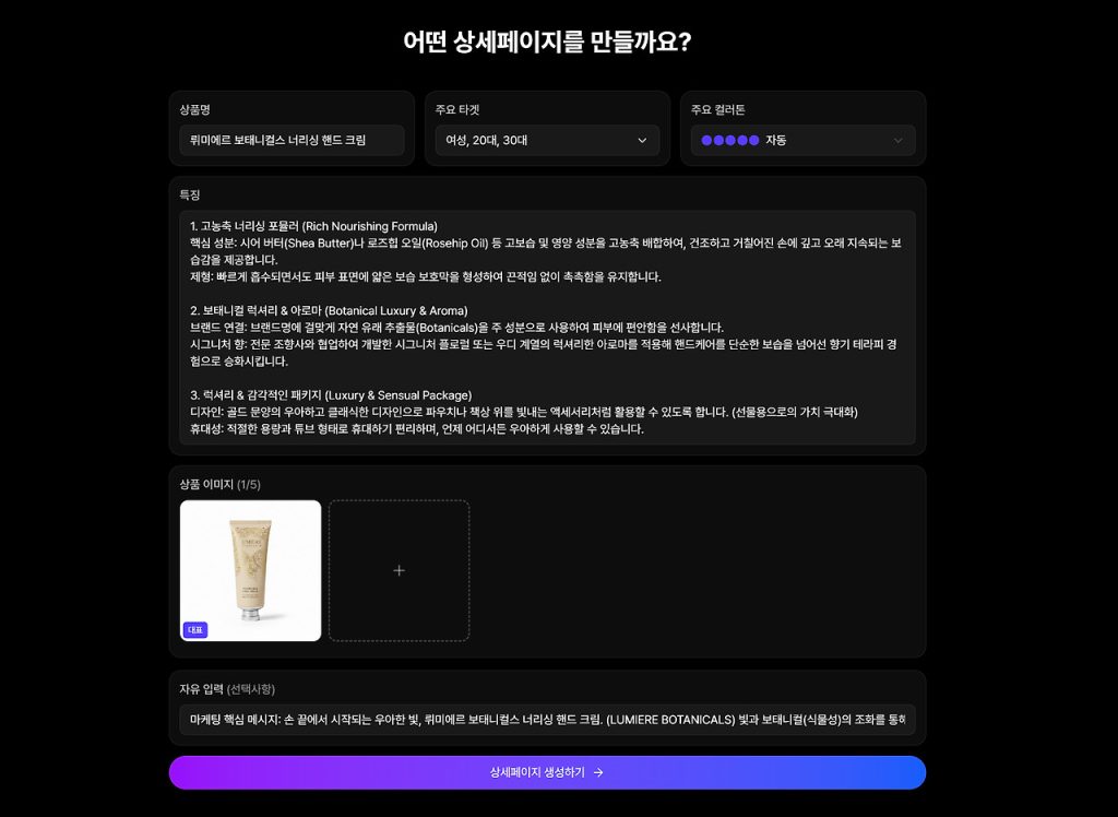 하지만 전문적인 상품 촬영은 비용과 시간이 많이 듭니다. 스튜디오 대여부터 모델 섭외, 사진 합성 작업까지 고려하면 상당한 부담이죠. 특히 화장품 상세 페이지처럼 세밀한 제품 표현이 필요한 경우엔 더욱 까다롭습니다.