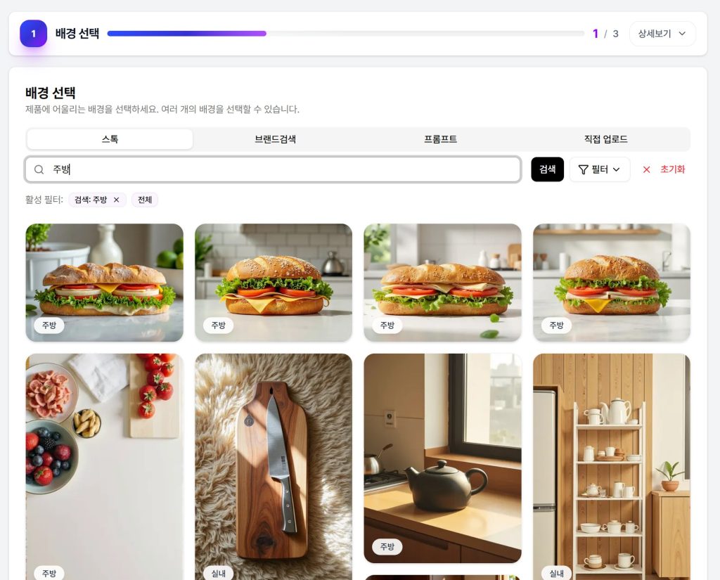 스톡, 브랜드검색, 프롬프트, 직접 업로드 4가지 방법 중 하나로 원하는 배경을 선택하세요. 스톡에서 고르는 것이 가장 쉽고 빠릅니다.