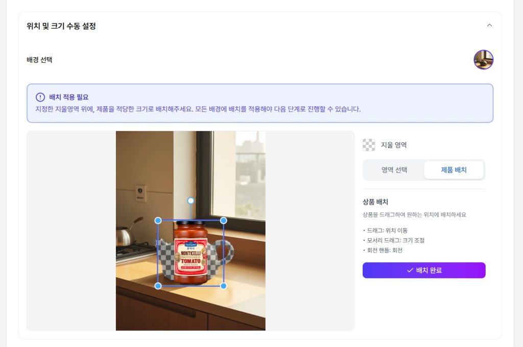 선택한 배경 이미지에서 제품을 배치할 위치를 지정하세요. 크기와 각도를 자유롭게 조정할 수 있어요.