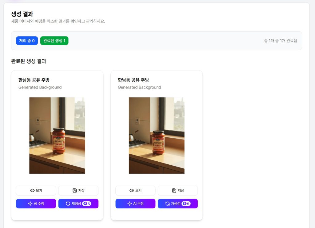 약 30초~1분이면 조명, 그림자, 색감이 자동으로 조정된 전문가 수준의 제품 사진이 완성됩니다!