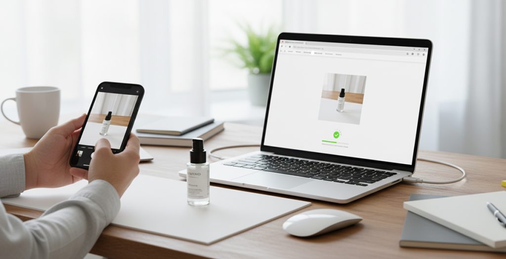 스마트폰으로 찍은 기본 제품 사진을 업로드하세요. AI가 자동으로 배경을 제거해줍니다.