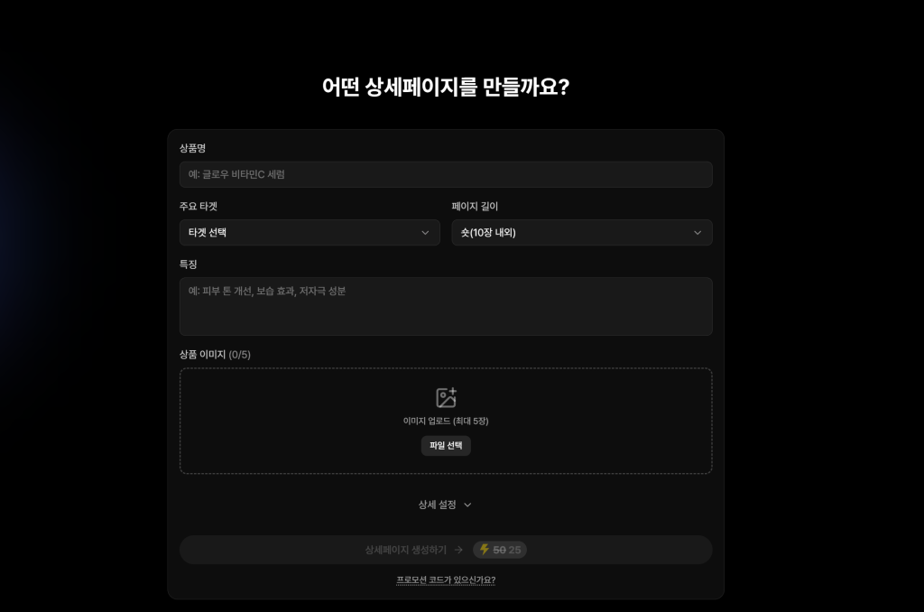 복잡한 디자인 툴을 배울 필요가 없습니다. 제품 정보와 기본 제품 사진만 업로드하세요. AI가 자동으로 상세페이지 기획, 카피라이팅, 그리고 각 섹션에 어울리는 연출 이미지(모델 착용 컷 등)까지 즉석에서 생성해 줍니다.